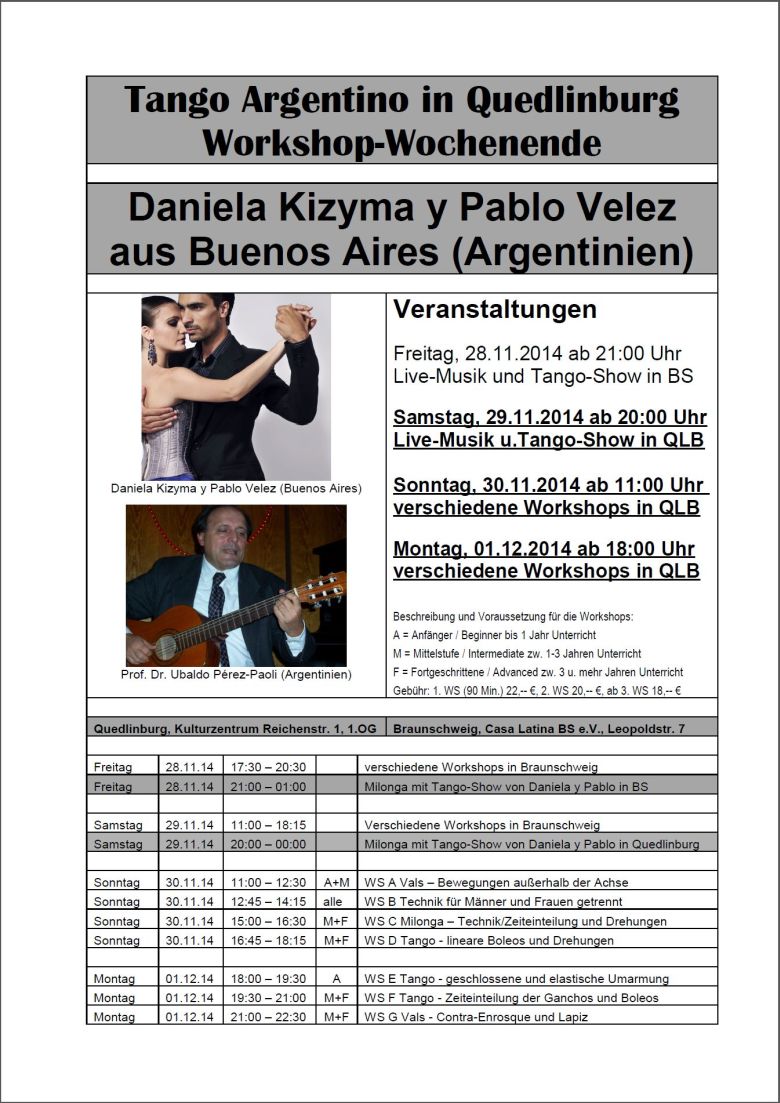 Ankündigung: Workshop-Woche mit Daniela Kizyma y Pablo Velez (Buenos Aires) vom 29.11. bis 01.12.2014.